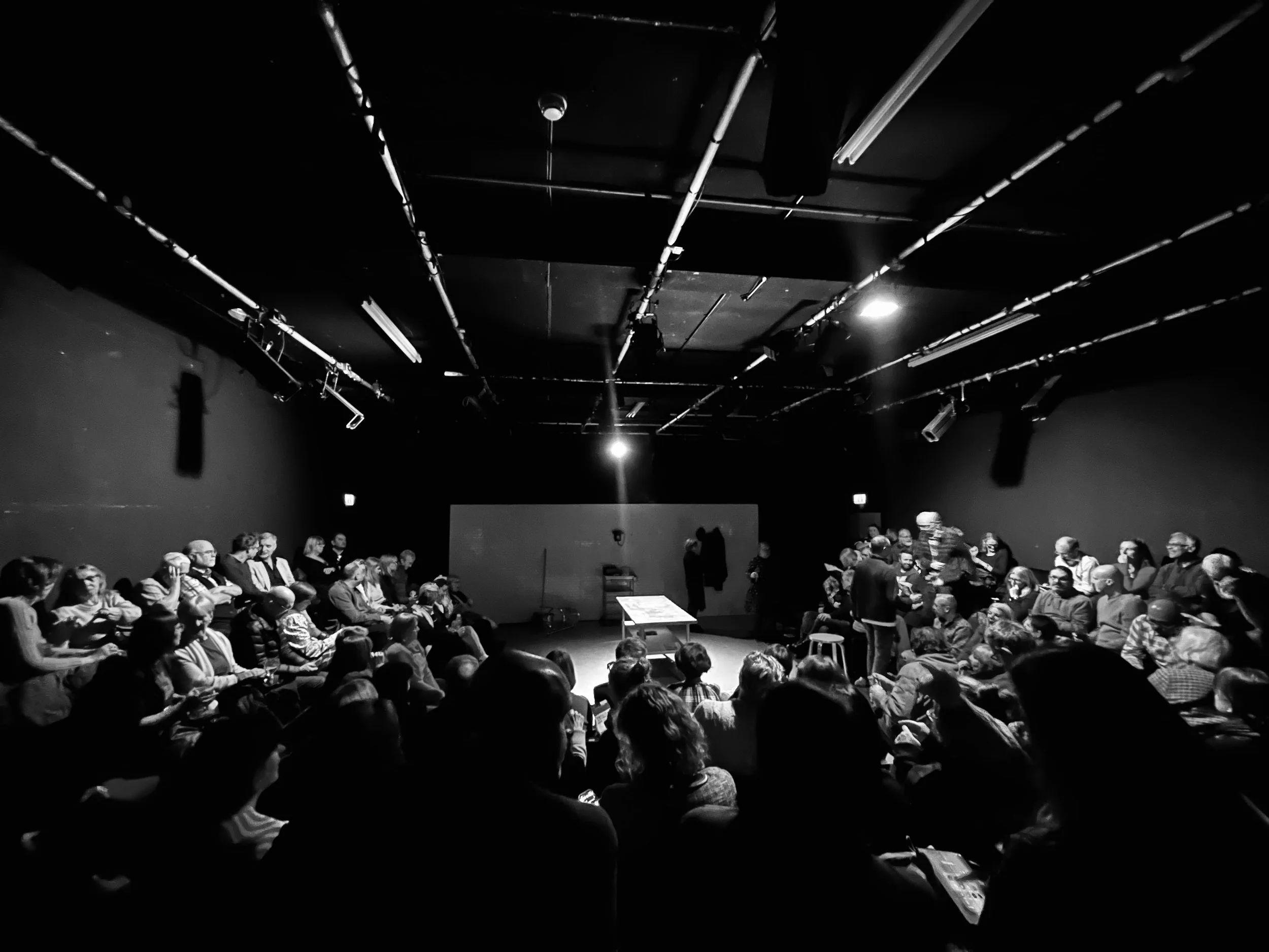 We had an onstage spot speaker for a 1960s telephone effect as well as a radio which would spark in and out throughout the performance.